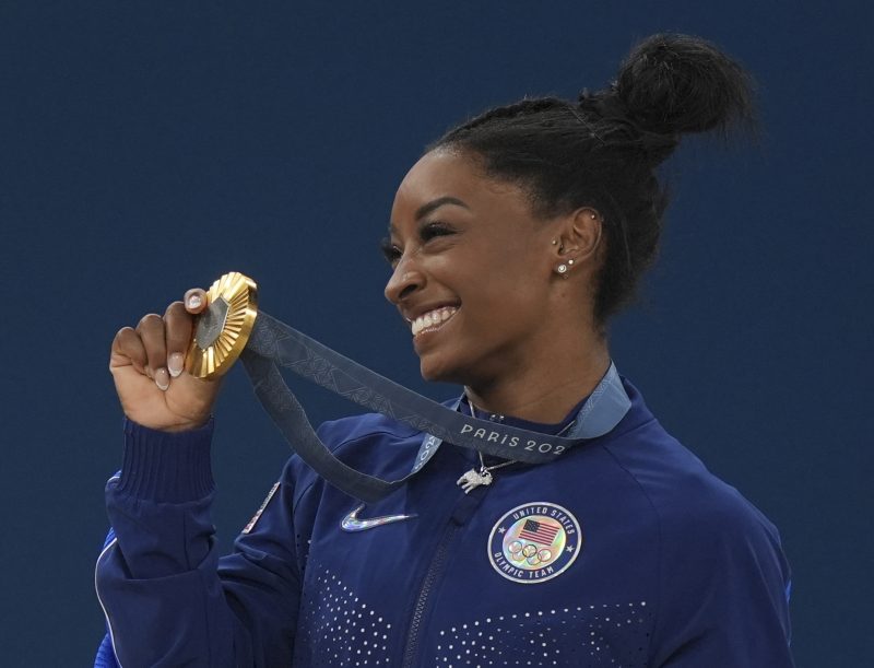 PARIS — Fresh off her second gold medal win at the Paris Olympics, U.S. gymnast Simone Biles seemed to take a dig at Donald Trump with a social media post declaring: “I love my black job.”