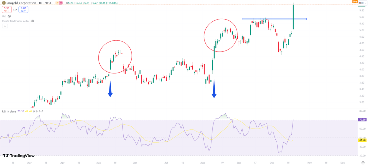 IAG stock price target has risen 150% since January 2024. The daily chart suggests potential upward movement soon. Previous analysis shows when the 14 EMA breaks the RSI 70 level, it often leads to a 6% to 10% rise. From September 16 to 27, 2024, the stock faced rejection at $5.50. It finally broke through this level last Friday.