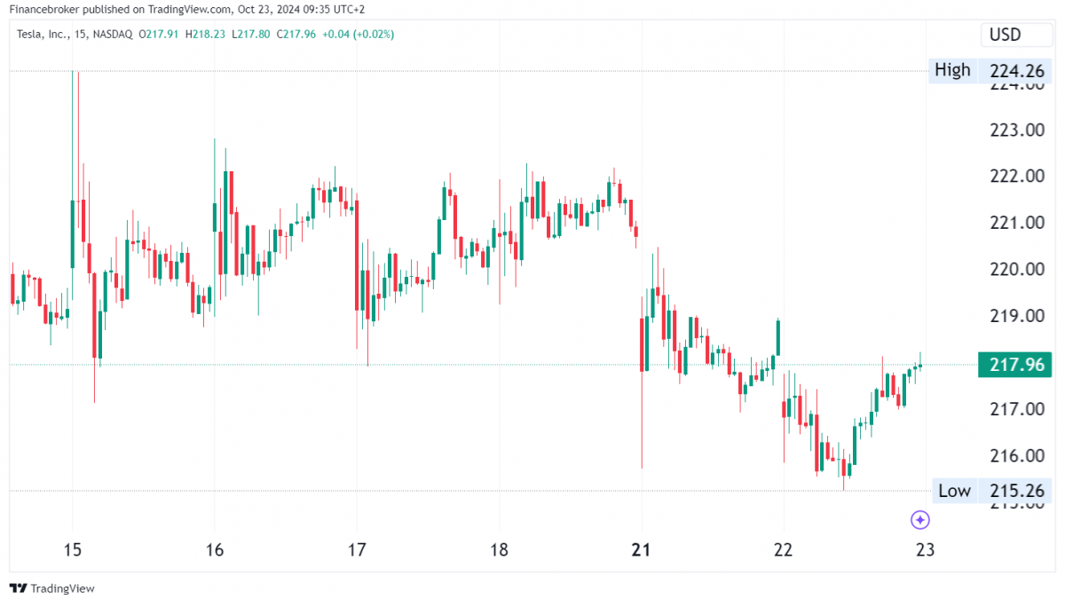 The approaching Tesla’s third-quarter earnings report shows that the stock is struggling to find a direction. To illustrate, the chart clearly reflects that Tesla has been bouncing between $215 and $224 since mid-October, with a brief rally hitting a peak of $224.26 before returning to $217.96 as of October 23.