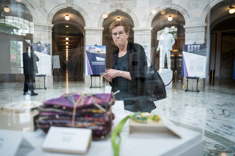 On Wednesday morning, visitors who wandered through the rotunda stopped to take in the display. Some read every panel, while others paused for a quick look before moving on. One woman posed for a photo in the middle of the room, without appearing to recognize the significance of the damaged prayer book in the case next to her.